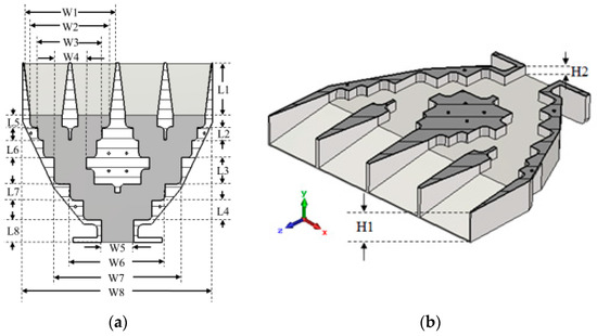 Cross-section views of the power dividing horn subarray: (a) top view; (b) perspective view.