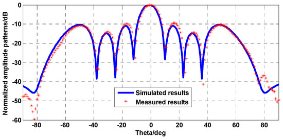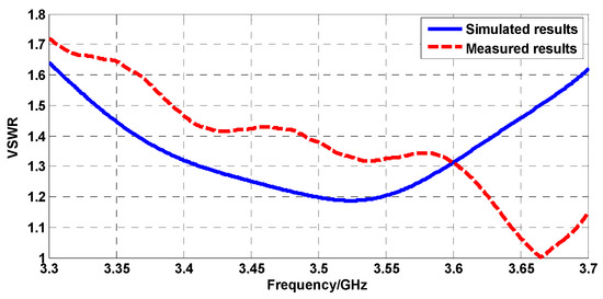 The results of VSWR are shown in Figure 12. Although the measurement results were higher than the simulated results, the matching of the subarray is good enough for application. The pattern at 3.5 GHz in the xoz-plane is shown in Figure 13, and the simulation results almost coincide with the measurement results in wide angles.
