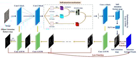 The self-attention feature map gives a rough but informative prior about visually significant regions. Many previous researches on pixel-labeling tasks have shown that neural networks can combine high-level feature information by encoding at the upper network layer to produce fine labeling results [,,]. Therefore, we believe that our model can infer more detailed object attention information based on the self-attention feature map derived from high-order network layer reasoning. After training, the network model aggregates the information of the high-level self-attention feature map and the rich spatial and detailed features of the underlying network through the feature pyramid [] strategy to focus on and continuously refine the objects in complex backgrounds. As shown in Figure 2, the model is calculated from top to bottom and integrates information from earlier layers in turn. A plurality of conv-LSTM networks (green blocks in the figure) are stacked to construct more meaningful feature expression results by circular connection. We use the sequence and memory characteristics of LSTM to process the features in an iterative manner. At a certain level, conv-LSTM abandons the feature of small information amount and strengthens the feature of large information amount, thus generating a gradually improved inference object reinforcement self-attention feature map [].