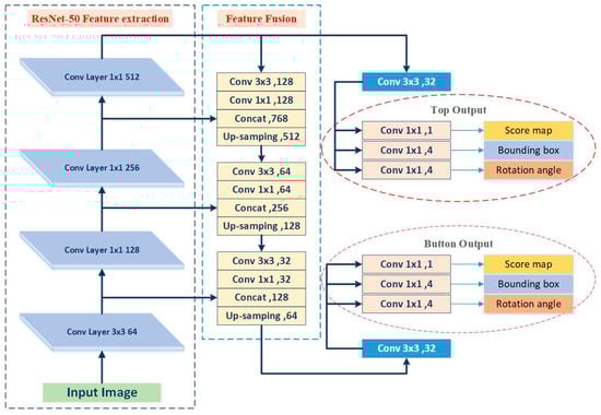 Architecture of our AD-FCN. AD-FCN is mainly divided into three parts: feature extraction, feature fusion, and result output. In order to avoid the problems of over-fitting and gradient explosion that may occur in the training process, the initialization of the feature extraction network was completed by using the transfer learning method and the ResNet50 [] model for reference. In the feature fusion part, the U-Net idea was used for reference. On the basis of FCN, the high-dimensional and low-dimensional features in the convolutional network are fused to realize pixel-level classification of images and improve detection accuracy. In the output part, the confidence score map of one channel, the rectangular frame boundary information map of four channels, and the object rotation angle map of one channel are obtained through three 1 × 1 convolution layers [].