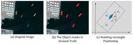 Two parameters are needed for the location of the rotating rectangular frame: the orientation angle of the object and the boundary information of the rectangular frame. In the AD-FCN network, firstly, the object in the training data is labeled clockwise with a rotating rectangular frame, and then the object mask is generated according to the labeling information, as shown in Figure 4.