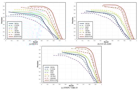 Here, we evaluate the performance of SOSA-FCN on its main task: SOD. Three widely used datasets, DOTA, UCAS-AOD, and NWPU VHR-10, were quantitatively studied. We compare SOSA-Net with alternative methods based on in-depth learning: P-FCN, ELD [], RFCN [], DHS [], HEDS [], DSSOD [], AS-Net. We also consider several classical non-in-depth learning models: HS [], DRFI [], and DSR [], using results from authors or running their open source implementations through the original settings. We report in Table 2 the maximum F measurements (Fβ) and MAE scores. Overall, the proposed method achieves better performance on three datasets using all evaluation indicators.