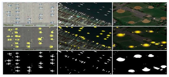 Qualitative results of SOSA-FCN. The first row shows the original images, the second row shows the fixation maps of the object, and the third row shows the attention feature maps of the object.