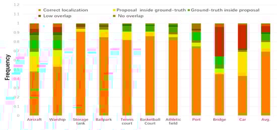 In order to further analyze the positioning error of AD-FCN, we classify each extraction object in positive training images as one of the following five situations: correct positioning (overlap (>50%), recommendation (complete) in real internal ground truth, recommendation containing real knots. None of the above situations is ground truth in origin, but no-zero overlap and no overlap []. Figure 7 shows the frequency of these five situations for each object class and the average error for all categories of AD-FCN. The experimental results show that the positioning accuracy of AD-FCN for different types of objects can reach more than 70%, which basically avoids the problem of no overlap error. Figure 7 shows that nearly 98% of the selected object detection frames overlap with their corresponding basic fact boundaries to some extent.