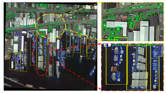 Figure 8 and Figure 9 are fusion detection results of multiple objects in DOTA and TGRS-HRRSDt datasets, with four categories of objects including: building (yellow border), vehicle (green border), ship (blue Border), aircraft (red border). By analyzing the experimental results, we find that the framework of this paper can complete a relatively fine and accurate detection of multiple objects in high-resolution complex scenes, has strong robustness against interferences such as illumination, shadow, occlusion, etc., and can also give reasonable detection frames for dense and small objects such as vehicles, aircrafts, ships, etc.