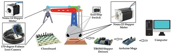 The structure of the system consists of a computer connected to an Arduino board, which is responsible for controlling the motors of the robotic arm using two TB6560 stepper drivers. The system incorporates a 170-degree fisheye camera [33] mounted on the arm grip and connected to the computer via USB (see Figure 1).