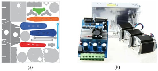 (a) Robotic arm parts for laser cutting; (b) Nema 23 stepper motors, driver, and power supply.