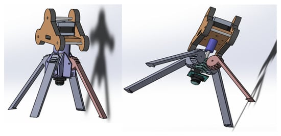 A four-finger gripper was designed using Solidworks software and subsequently printed using an Ultimaker 3D printer (See Figure 3). This was different from the design proposed by FabLab RUC. A Nema 14 stepper motor coupled to a worm was used with a linear gear to open and close the gripper fingers [34]. The design allowed the camera to be coupled in the center of the gripper.