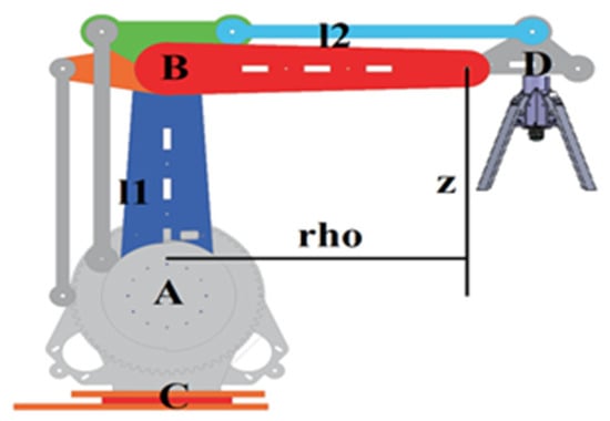 To solve the inverse kinematics, a penalty method was used with the square error of the position as a function J to minimize. This function finds the angles A and B for the desired rho’ and z coordinates. Here, rho’ is calculated with the visual servoing system, and z is fixed depending on the task or piece to be grasped.