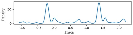 For the second stage of the process, kernel density estimation (KDE) [47] was used to find the two main groups of angles θ with a difference of 90 degrees, which correspond to the groups of vertical and horizontal lines. As long as there are not many parallel lines in the image, the angles of the chessboard lines correspond to the two highest peaks in the KDE (see Figure 6). The lines with angles distant to the board’s line angles were discarded.
