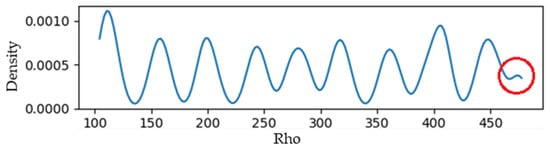 KDE of rho distances for vertical or horizontal group of lines. The peak in the red circle corresponds to one of the board’s edge lines.