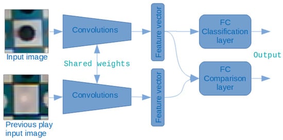 Later, a Siamese network [51,52,53,54] that compares the image of the current move with that of the previous move was designed in order to detect movements. The feature vector of the convolution stage was used for color recognition and for movement detection using additional network layers, but the vector from the previous movement image was used only for the comparison layer (see Figure 8).