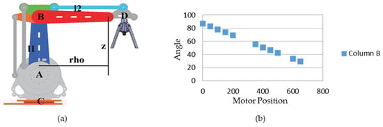 To perform the calibration of the robot, a mapping is made between the stepper motor positions and the angles of the segments via linear regression (see Figure 11b). The angles were measured with the gyroscope from a cell phone. With the motors disabled, the robot moves manually to the position to be measured; thus, it is possible to use the G28 code to obtain the motor positions corresponding to the segment angles. Note that the angle of segment B is independent of motor A (see Figure 11a).
