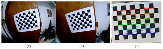An example of the distorted image can be seen in Figure 16a, while the results obtained with the corrected image are shown in Figure 16b. The process consists of searching the corners of the chessboard squares and making an image database that is used to create a distortion correction matrix (see Figure 16c).