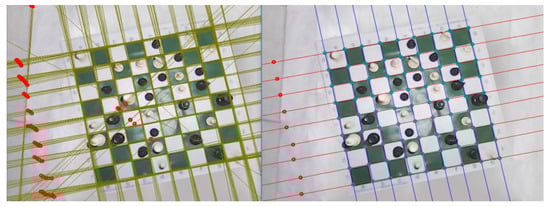 With the use of the Canny filter and the Hough transform, straight lines were detected on the board, which were filtered successfully using the Kernel density estimation. In this way, the peaks of the density function were interpreted as local averages in space to predict the positions of the lines on the board (see Figure 17).