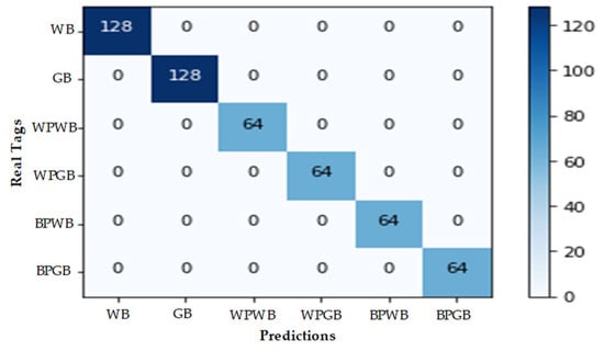 Confusion matrix. Tags: white background (WB), green background (GB), white piece on white background (WPWB), white piece on green background (WPGB), black piece on white background (BPWB), and black piece on green background (BPGB).