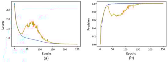 (a) Losses vs. training epochs. (b) Precision vs. training epochs.