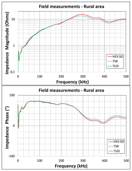 - Fernández, I.; Arrinda, A.; Angulo, I.; de la Vega, D.; Uribe-Pérez, N.; Llano, A. Field Trials for the Empirical Characterization of the Low Voltage Grid Access Impedance from 35 kHz to 500 kHz. IEEE Access 2019, 7, 85786–85795. [Google Scholar] [CrossRef]