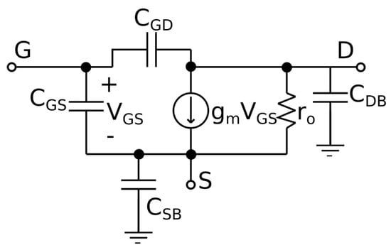 The oscillation frequency of a VCO can be evaluated using Equation (1), and, to vary such a frequency, a CMOS CML stage with active load is usually employed, as shown herein. In this manner, the CMOS CML stage has a P-type MOS transistor as load, which operates in the triode region and its associated resistance is controlled by a voltage source . The associated resistance of the active load is connected with a load capacitor in which both give rise to a time constant , so that varying makes varying the oscillation frequency [], and depending on the number of CML stages N, one can use Equation (1). Extending the oscillation frequency in a wider range that can be controlled by varying , requires a good design methodology. For instance, one must consider the number of stages that must be connected in a ring topology, as well as the delay of each CMOS CML stage. At first sight, one can think on reducing the number of stages and their associated delay to increase the oscillation frequency. However, the main effects are that decreasing N yields a reduction in gain, which may result in the oscillation eventually stopping. In this manner, this article shows that deriving the symbolic approximation of the dominant pole of the CMOS CML stage, through the use of the high-frequency small-signal equivalent model of the MOS transistor [], can help to enhance the oscillation frequency.