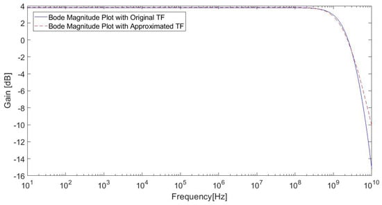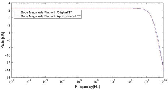 The approximation of the dominant pole is performed in the same way as done for the CML stage with passive load, and it can be approached by Equation (6). The comparison of the Bode magnitude of both the original and the approximated transfer functions (TF) is shown in Figure 6. Again, it can be appreciated that the dominant pole depends on both , of the differential pair, and of the active load [], so that the reduction of the transistor’s sizes leads to an increase of .