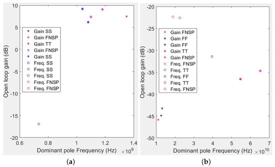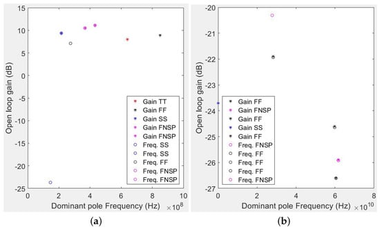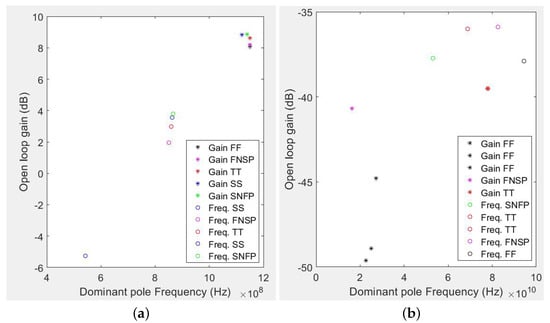 The characterization of the CMOS differential stage with active load provides the results given in Section 4, where one can see the comparison between the performances with and without post-layout simulations. The PVT variations are simulated setting , considering five process corners (TT, SS, SNFP, FNSP and FF), three voltage variations ( of ), and three temperature variations ( C, C and C) []. The higher and lower gain and frequency values are shown in Figure 7. One can see that the higher dominant pole frequencies are achieved in the FNSP and TT process corners; however, the FNSP corner also presents some of the lowest dominant pole values along with the SS corner. Table 2 summarizes the PVT simulation results.
