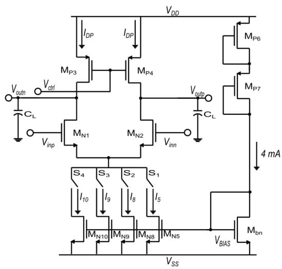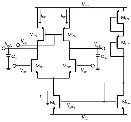 Figure 5 shows the CMOS differential stage with active loads implemented by P-type MOS transistors ( and ) that must operate in the triode region. The value of the equivalent resistance is controlled by varying the voltage at the gates of the PMOS transistors, which is called control voltage [,]. The output conductance of the PMOS transistor can be approached as . The sizing of - must accomplish and Equation (5) []. To achieve a wide range of control-voltage, the sizes are: m, m, m, m, and m, in all cases m.
