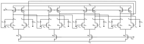 Originally, current mode logic (CML) was used as a mean to design VLSI logic gates to accomplish nanosecond delays. CML emerged with bipolar junction transistors (BJT) [], and the aim was focused on eliminating the emitter-coupled logic (ECL) drawbacks at that time, such as large power consumption and excessive heat generation []. When CMOS technology was used to design CML stages, it was introduced with the adaptive pipeline technique to compensate for deviations in the MOS device’s parameters and in the operating environment, which in turn was used to compensate for clock skew and to decrease the power dissipation []. It was shown that CML has many advantages, including high speed symmetric operation, equal noise margins, equal rise and fall times, requirement of relatively few components and low power dissipation. The symmetric operation feature allows an operation with a lower logical swing, thus improving the operating speed even more. That way, several CML blocks have been used for the implementation of various topologies and logic gates, such as, buffers, latches, flip-flops, XOR gates, and push–pull topologies, among others. In this manner, this article introduces the design of a wide-band voltage-controlled oscillator (VCO) that is implemented using CML stages connected in a ring topology. It is worth mentioning that designing VCOs is a challenge [,,]; besides, one can find guidelines to deal with modern design issues, such as ultra-low-power requirements []. Other important applications require robust VCOs, such as in designing analog-to-digital converters [,] or phase-locked loops []. Some VCOs are designed using complex devices such as negative differential resistances [], and others such as the one introduced herein use blocks connected in a ring topology [].