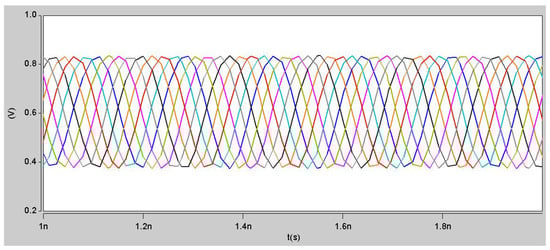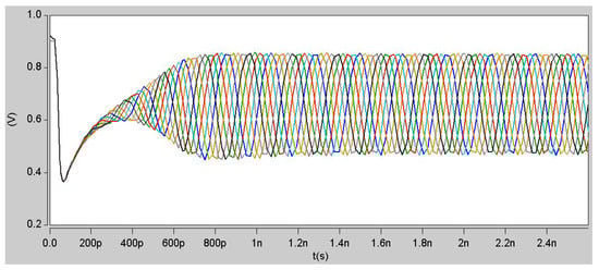 The four switches shown in Figure 12 allow a discrete variation of the current that can be programmed using four bits. Each MOS transistor is sized differently to provide a fraction of the current that will flow in the tail of the differential pair. That way, the programmable current ranges can be established to be between 3 mA and mA, and the current flowing through the bias transistors is defined to be 4 mA. Therefore, to be able to program the tail current with discrete values, the MOS transistors and are sized to drive a current of 4 mA, 2 mA, 1 mA and mA, respectively. The sizes of those MOS transistors are the following: m, m, m and m. In this case, the logic states of the switches are programmed as shown in Table 4, which summarizes the logical values needed to produce each tail current, where a logical 1 is produced with a pulse of 0.9 V and a logical 0 with a pulse of 0 V, the pulses are mean that the corresponding switch must be closed and open, respectively. It is worth mentioning that the design of the switches must be done carefully to mitigate the on parasitic resistance and capacitances of the MOS transistors. Figure 14 shows the programmable tail currents in the VCO’s output waveforms generating an oscillation frequency for a 3 mA tail current. The tendency of the oscillation frequency to decrease with an increasing tail current coincides with the programmable VCO’s results shown in Figure 13.
