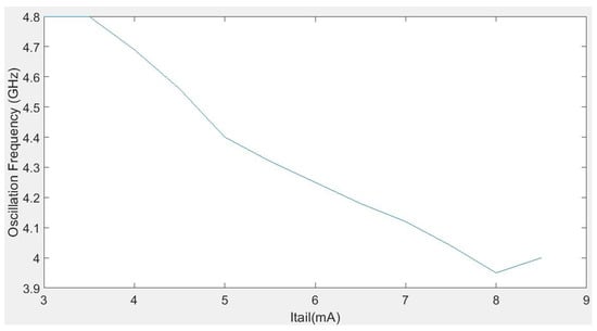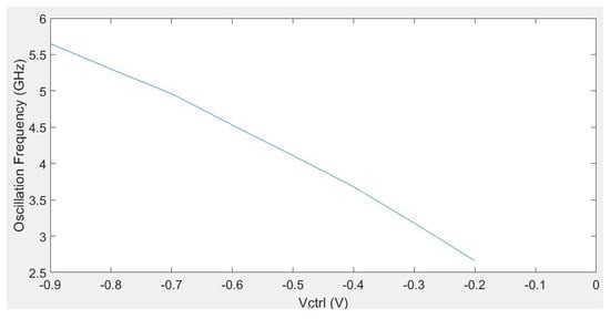 Finally, as stated by Equation (1), the oscillation frequency is inversely proportional to the number of stages, so that a reduction of stages leads to a reduction in the gain, and augmenting the stages leads to a reduction in the frequency range. For instance, performing simulations using six CMOS differential stages instead of four, the frequency range of the VCO is reduced from 2.65–5.65 GHz to 1.81–3.7 GHz. That way, using four stages is a good number to increase the range of frequency and voltage-control.