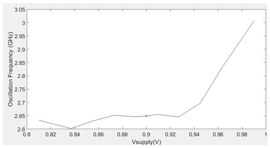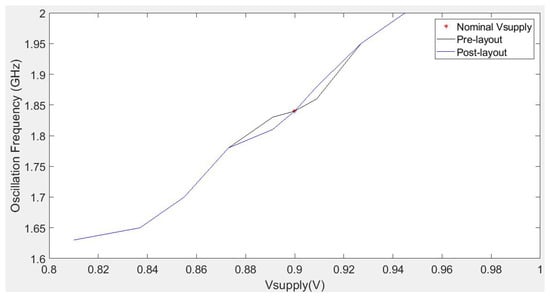 To measure the static supply sensitivity of the VCO, the change in the oscillation frequency due to a supply voltage variation is measured [], and the results are shown in Figure 20 for both the pre- and post-layout VCOs. The results show a static supply sensitivity of and for the VCO and the post-layout VCO, respectively.