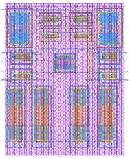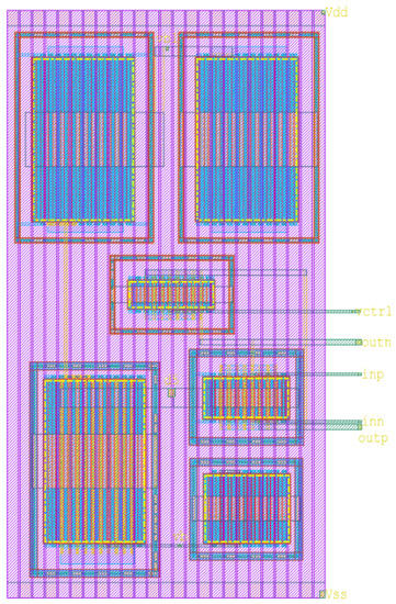 The minimum width and length sizes of the MOS transistors for a 180 nm UMC technology are m and m, for the NMOS and PMOS transistors, respectively. The minimum diffusion area is 0.1936 m, the minimum poly to diffusion spacing is m, and the minimum implant overhang of diffusion equals m. The sizes for the SPICE simulations are slightly modified to achieve a highly symmetrical layout in order to reduce mismatches []. The MOS transistors are placed with the same orientation and maintaining the NMOS and PMOS accommodated in different areas of the chip, but trying to use minimum silicon area. The placement of each transistor is the first task to get a symmetrical layout; after this, electromigration rules are taken into account to determine the minimum amount of fingers, which are necessary for the desired current to flow through each metal without damaging the integrated circuit. In this manner, the efficient placement is to maintain NMOS transistors at the bottom block and the PMOS transistors at the top block, to achieve a good matching between the differential pair transistors, which are placed in an interdigitated structure and over . The layout of one CMOS differential stage with active load is shown in Figure 15, which occupies an area of 6377 m, including the power grid.