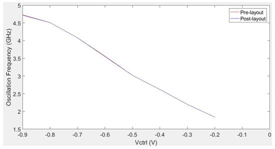 Comparison of the oscillation frequency vs. control voltage for the pre- and post-layout simulations of the VCO.