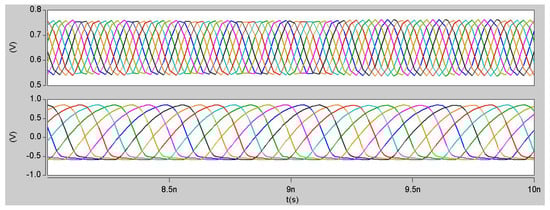 Post-layout output waveforms of the VCO for V (top) and V (bottom).
