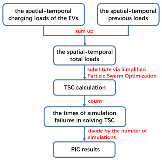 The calculation of charging loads of EVs needs to be simulated many times, so it will take a lot of work to substitute the simulation results into the calculation of TSC. Therefore, this paper chooses the simplified particle swarm optimization algorithm to solve the problem, which is quick in speed and high in accuracy. If the distribution network can supply power normally, the simplified particle swarm optimization algorithm can complete the calculation and work out the TSC value of the distribution network with EV integrated; but if the power supply capacity is insufficient, the algorithm cannot complete the calculation and will report an error. Finally, PIC can be calculated by counting the simulation times that cannot be solved, and the specific operation process is shown in Figure 2 below.