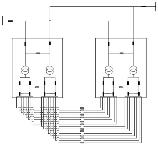 The distribution network used for illustration consists of two substations, each consisting of two main transformers, and the 10 kV side power supply area is connected by 32 feeders. Moreover, each main transformer has a capacity of 50 MVA and each feeder has a capacity of 8 MVA.