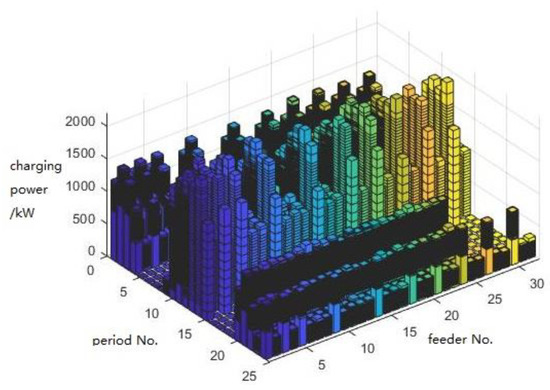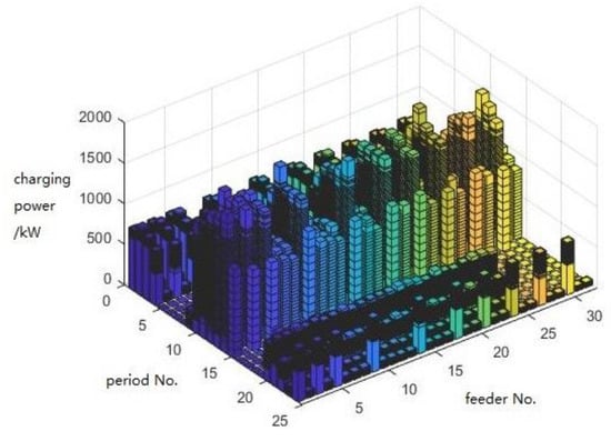 Based on the above analysis, the spatial-temporal distribution of EVs in the distribution network is simulated, among 32 feeders and including 24 periods, as shown in Figure 4 below.