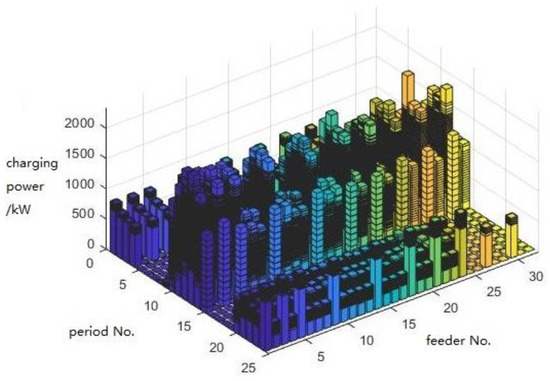 Based on the above analysis, the spatial-temporal distribution of EVs in the distribution network is simulated, among 32 feeders and including 24 periods, as shown in Figure 7 below.