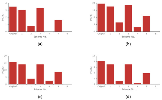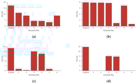 Among the six schemes, schemes 2, 4, and 6 are involved in adjusting the charging behavior of the taxis. Figure 6 shows that, PIC has changed markedly under these three schemes, while other schemes which only adjust private cars have little effect on the reduction of PIC. After reasonable speculation, charging loads during the risk period are greatly affected by taxis.