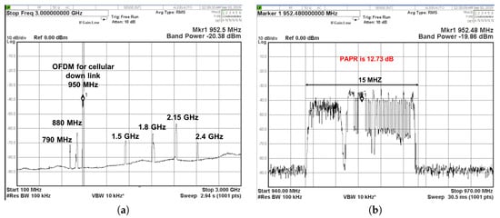 Measured spectrum of RF signals at the measurement position: (a) Spectrum of RF signals and (b) Magnified spectrum of the 952 MHz signal.
