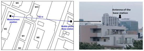 As shown in the Figure 1, the RF signal at 952 MHz is the strongest, the power density at 100 kHz BW resolution is about −40 dBm, and the band power at 15 MHz BW is approximately at the −20 dBm level. The magnified spectrum of the 952 MHz signal is shown in Figure 1b. From the characteristics of the signal, it is concluded that the signal corresponds to an LTE downlink mobile phone signal with an orthogonal frequency division multiplexing (OFDM) modulation. Figure 2 shows the map of the measurement position. The mobile phone base station and antenna were located at the top of a building. The measurement position is in the center of the office room on the third floor. The measurement point and the base station are approximately 162 m apart.