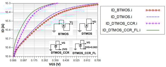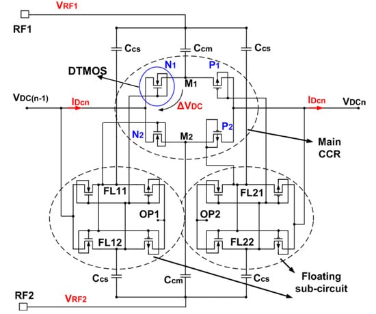 In the dynamic threshold voltage MOSFET (DTMOS) technique, the body of the MOSFET is tied to the gate. A very low voltage on the DTMOS technique to obtain a much higher current drain than regular MOSFET has been reported []. In the energy harvesting technique, DTMOS is applied to the rectifier circuit as a diode-connected rectifier [], self cancellation configuration [], cross-coupled rectifier []. In our study, we propose the application of DTMOS to CCR with floating sub-circuits. Generally, the RF level in an environment ranges from −30 dBm to −10 dBm. At this level, we proved the amount of DC voltage level-up obtained from floating sub-circuit driving to DTMOS leads to an increase in drain current. The drain current of the proposed circuit is the highest when compared to the other configurations.
