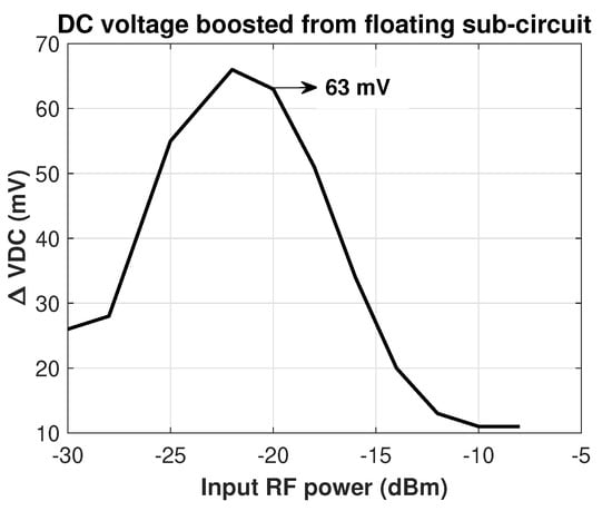 Considering the NMOS N1 in the main CCR, as shown in Figure 3, in forwarding bias region, the gate of N1 corresponds to FL12, and the source of N1 corresponds to M1. The difference in the levels of DC voltages between the points is denoted by , as indicated in Equation (3). The voltage represents the effectiveness of CCR with floating sub-circuits in comparison to a conventional CCR. Figure 4 shows the simulated dependence of on the input power in the CCR with floating sub-circuits. As shown in Figure 4, at the target input power range, the floating sub-circuit brings an amount of DC voltage to the gate-to-source voltage of MOSFET in the main CCR. At an input power of −20 dBm, the amount of becomes 63 mV.