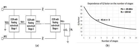 N-stage CCR with floating sub-circuits: (a) block diagram of the circuit, and (b) simulated dependence of Q factor on the number of rectifier stages.