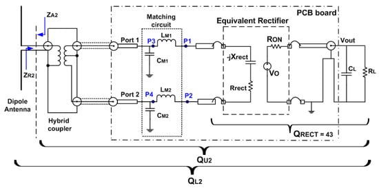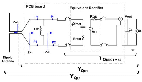 Figure 8 shows equivalent circuit of RFEH scheme 1. In the figure, is unloaded Q factor, and is loaded Q factor at feed-point of the antenna of scheme 1.