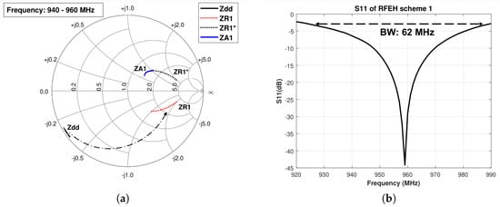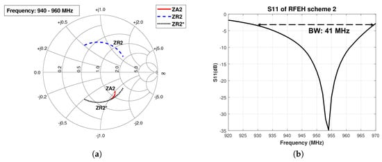 Figure 13a shows a measured impedance of the RFEH scheme 2. The impedance at the feed point of scheme 2, which is denoted by in Figure 8, has an inductive property. A 14.3-cm wired dipole antenna whose length is equivalent to 0.45 wavelength at 950 MHz is designed to match with the rectifier. The Figure 13b shows S11 of the RFEH scheme 2. Bandwidth at −3 dB level is 41 MHz from 928 MHz to 969 MHz. A center frequency is 954 MHz. and calculated from Equations (1) and (5) are 23 and 46, respectively.