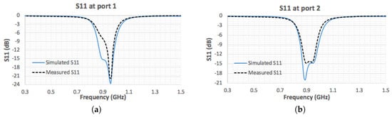 Figure 12 shows the simulated and measured reflection coefficients S11 at Port 1 and Port 2, respectively. Because the rectifier is a nonlinear circuit, so harmonic balance method (HBM) of advanced design system (ADS) software is used for simulation. At each frequency, input power is set up, then input voltage and current are simulated. From these parameters, an input impedance of the rectifier at specified input power and frequency is defined. The simulated S11 is calculated from the input impedance of the rectifier. Figure 12 indicates that the simulated and measured results are almost identical. The frequency band of the target RF signal corresponds to a range of 945–960 MHz, which is within the −10 dBm loss band.