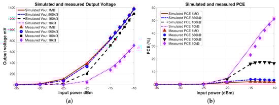 Figure 16, Figure 17 and Figure 18 show the measurement results of the proposed RFEH in the chamber room. The rectifier circuit is designed to match with the antenna, thereby achieving higher results when measuring in an anechoic chamber as compared to those obtained with a signal generator. In Figure 16a, the output voltages of the proposed system at 10 M load are presented. The sensitivity 1 V is obtained at a level of −17 dBm input power of modulated signals. Figure 16b shows the PCE of the proposed RFEH system when harvesting CW signals at different input powers and loads. From the Figure, the highest PCE of 57% is achieved at −10 dBm input power and 10 k load.