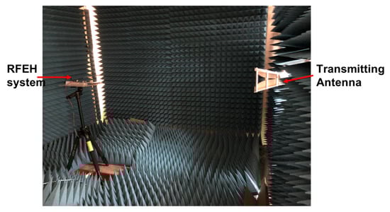 The proposed RFEH system was measured in an anechoic chamber, as shown in Figure 15. The RF power at the measurement point is defined by measuring the received power using a reference dipole antenna, CANDOX 44Sa21.
