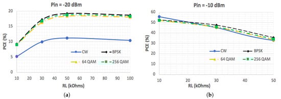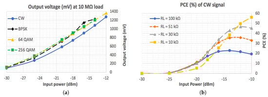Figure 17 shows the PCE of the proposed system at different input power levels when the RFEH system harvests the CW signal and modulated signals. The characteristic of the modulated signal is defined by a Peak-to-Average-Power ratio (PAPR). The PAPR was evaluated when a Complementary Cumulative Distribution Function (CCDF) of the signal is 0.001% []. In our measurement, PAPRs of CW, BPSK, 64 QAM, and 256 QAM signals are 0.1 dB, 2.82 dB, 6.23 dB, 5.76 dB, respectively.