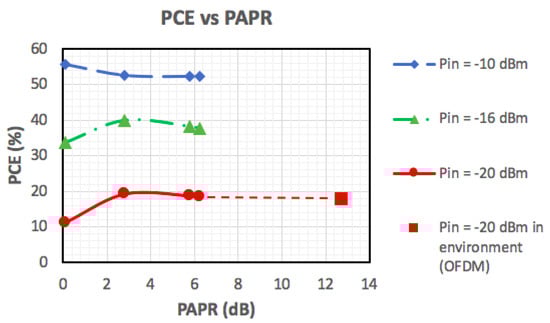 Measured dependence of PCE on Peak-to-Average-Power ratio (PAPR) of RF signal.